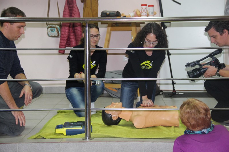 • Praktični preizkus temeljnih postopkov oživljanja in prikaz uporabe defibrilatorja na lutki – vsak udeleženec je lahko poizkusil oživljanje in uporabo defibrilatorja!